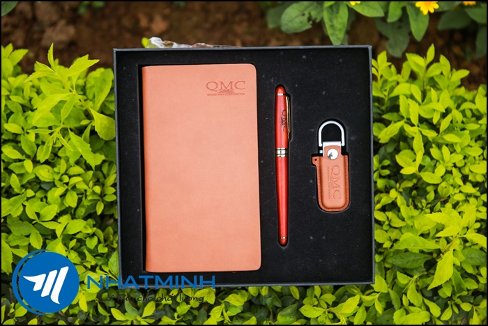 Bộ gồm : Sổ bìa dính A7 + usb da + bút gỗ + hộp đựng